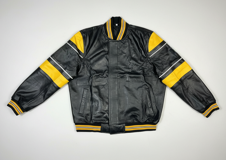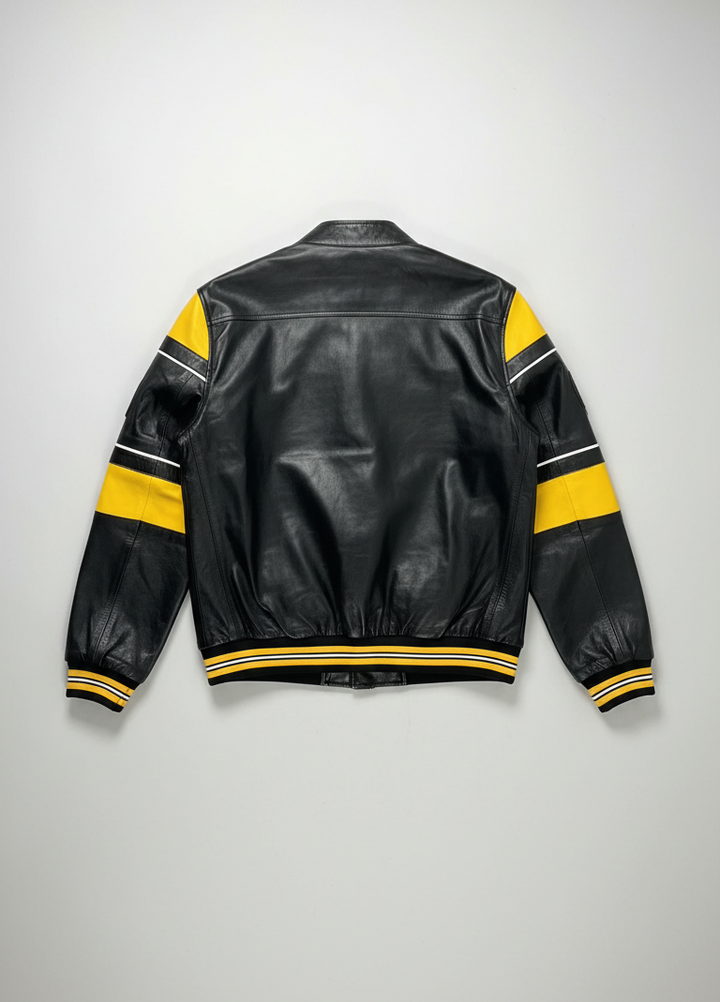 Crafted from premium, supple black leather, this jacket offers a luxurious feel and exceptional durability. It features prominent yellow and white striped detailing across the shoulders and sleeves, reminiscent of classic varsity or racing aesthetics. The ribbed collar, cuffs, and hem are also accented with complementary yellow and white stripes, completing the cohesive and stylish look. Whether you're heading to a game, a casual meet-up, or just want to add a vibrant touch to your daily wear, this jacket delivers on both style and comfort.