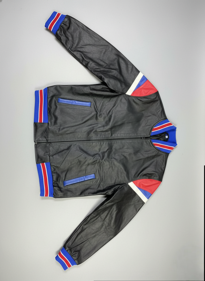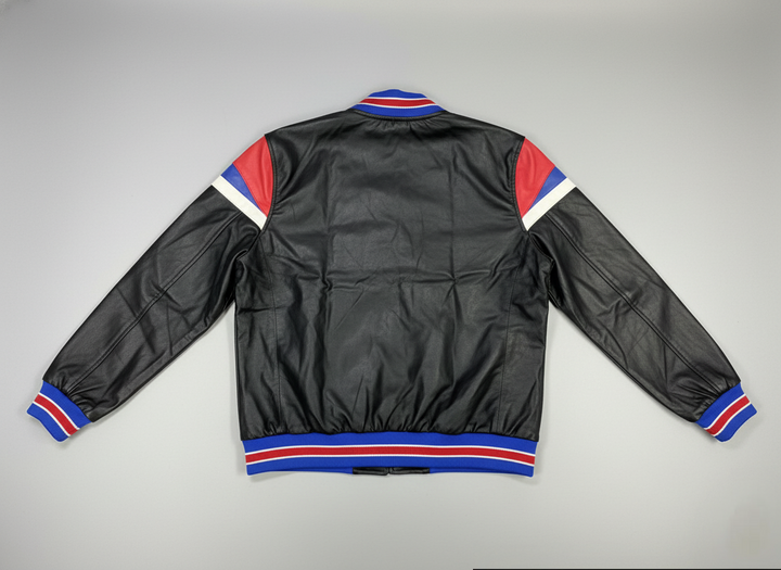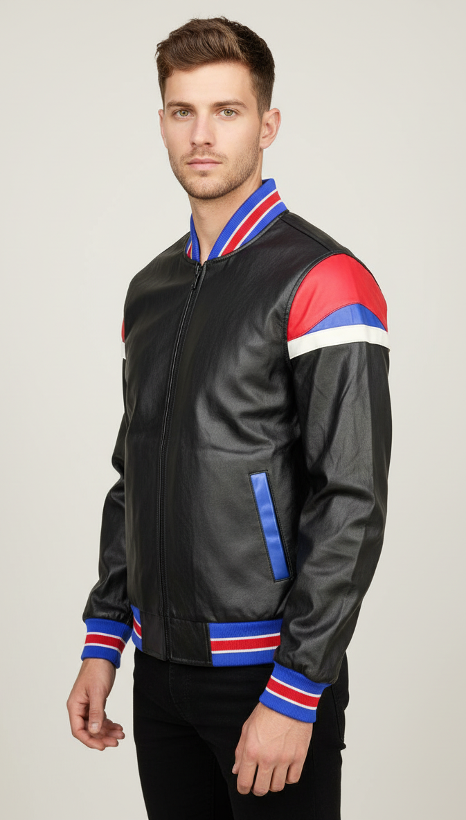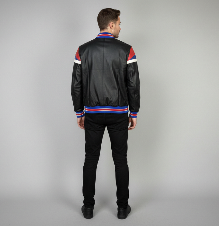 Crafted from premium black leather, this jacket offers both a sleek look and lasting durability. It features dynamic red, white, and blue striped accents on the sleeves, collar, and ribbed cuffs and hem, giving it a distinct racing or collegiate vibe. The front pockets are also highlighted with a pop of blue, adding to its unique charm. Whether you're aiming for a sporty, casual, or edgy look, this jacket is designed to turn heads and elevate your ensemble.