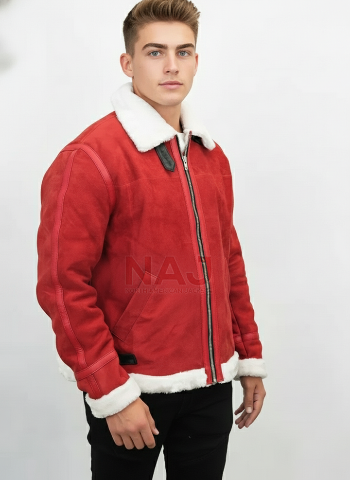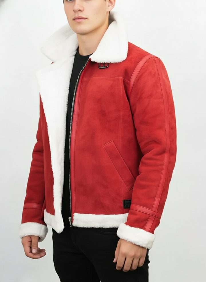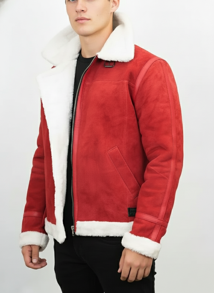 Embrace the festive spirit and conquer the cold in style with our Men's Red Shearling Biker Jacket. This striking winter coat is designed to make a statement, blending rugged biker aesthetics with luxurious comfort. Crafted from premium red suede-look material and sumptuously lined with soft white faux shearling, it's the perfect outerwear for chilly days and holiday gatherings. The iconic wide collar, cuffs, and hem, all adorned with plush faux fur, provide exceptional warmth and a touch of seasonal elegance. Whether you're cruising through winter cityscapes or attending a Christmas party, this jacket offers unparalleled warmth, comfort, and a bold, fashion-forward look. It's an ideal gift for him, ensuring he stays cozy and stylish throughout the winter season and beyond. Stand out from the crowd and add a vibrant splash of color to your cold-weather wardrobe with this must-have Christmas edition jacket.
