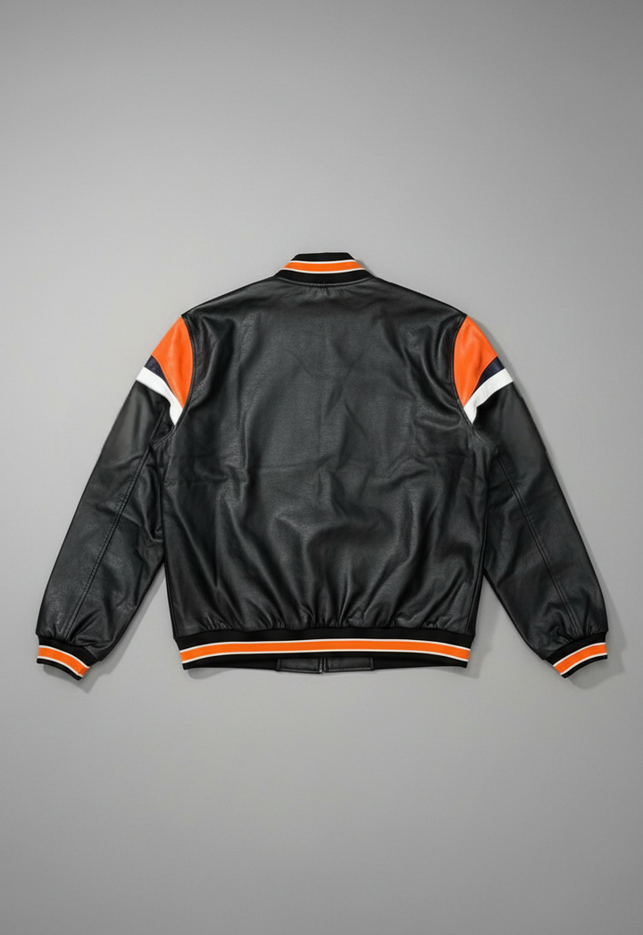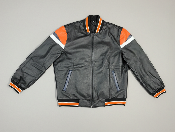 Crafted from premium black leather, this jacket offers a sleek look and exceptional durability. It features prominent orange and white striped accents across the shoulders and sleeves, providing a dynamic and sporty edge. The ribbed collar, cuffs, and hem are also detailed with complementary orange and white stripes, creating a cohesive and eye-catching design. A subtle touch of navy blue is integrated into the sleeve stripes and discreetly on the sides, adding depth to the color palette. Whether you're navigating city streets or heading to a casual gathering, this jacket ensures you make a distinct style statement.