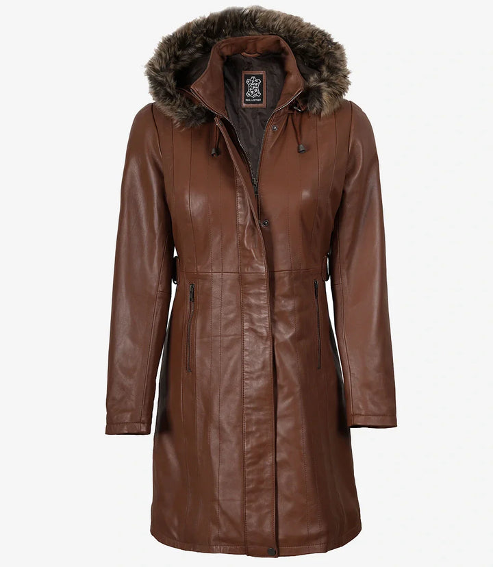 Women’s Brown Leather Coat with Faux Fur Trim & Removable Hood
