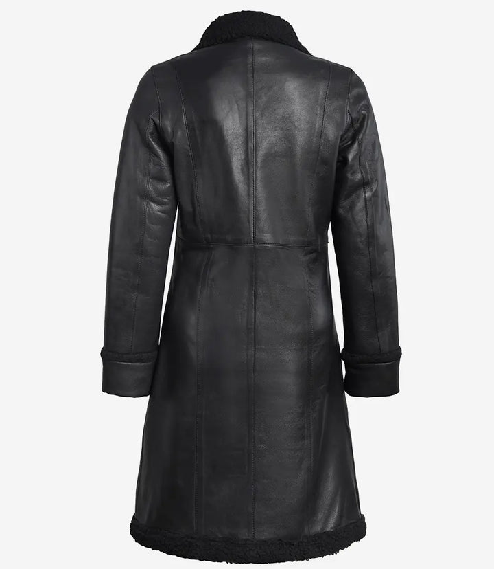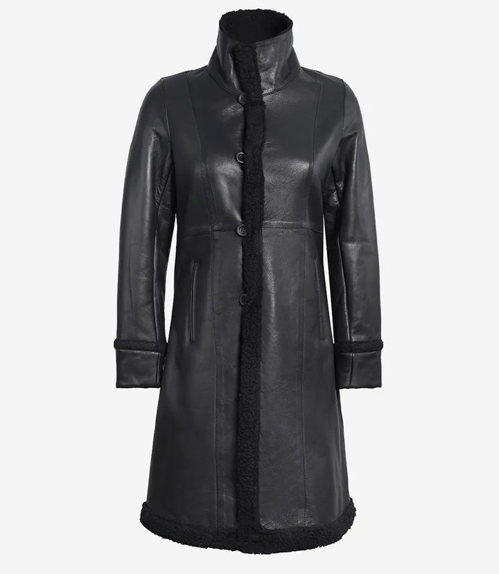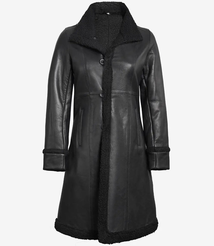 Women’s 3/4 Length Black Leather Faux Shearling Coat