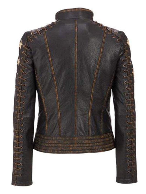 Women’s Star Pattern Vintage Style Distressed Brown Leather Biker Jacket